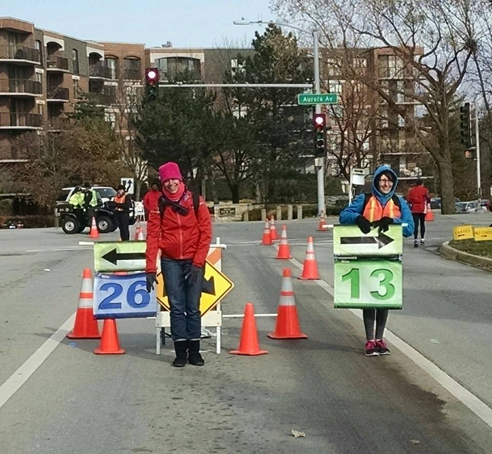 We lined up at the start, getting in to our respective corrals and bid each other high fives, hugs, and good luck. I turned and saw Claudia, a woman I met during the Fox Valley training runs I paced, so we agreed to start together. YAY! The national anthem was beautifully sung, (sang?) and the race kicked off…it only took about 10 minutes to cross the starting line. (They could’ve spaced this a little farther apart, as the course was slightly crowded the first few miles).